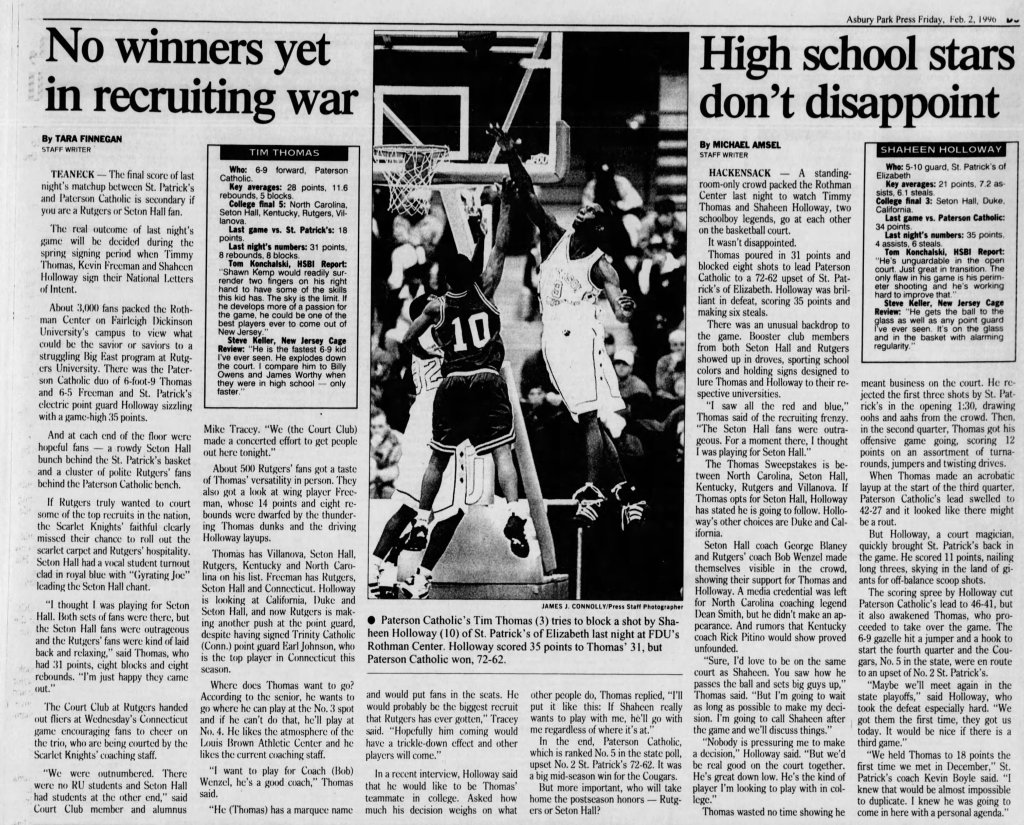 However, there is one game that will live in infamy. On February 1st, 1996, Paterson Catholic and St. Patrick’s met up at the Rothman Center on the campus of Fairleigh Dickinson University in Teaneck, New Jersey in front of almost 3,000 spectators. On that night, Thomas had 31 points, eight rebounds and eight blocks. Holloway held his own with 35 points, six steals and four assists. However, the Cougars won the game, 72-62.