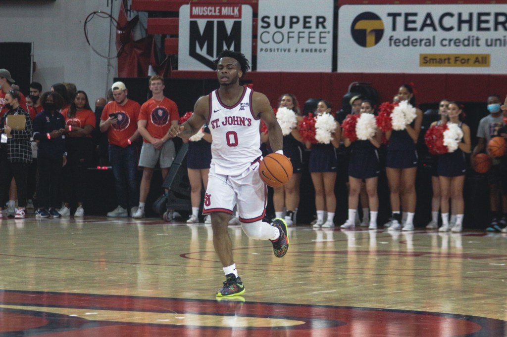 “It makes a big difference. The adrenaline gets going,” said St. John’s head coach Mike Anderson when asked about having fans in the stands after more than a year without having spectators. “It’s been a long time since we’ve been in the gym and had fans. I first want to shout out our fans that showed up here tonight. There was energy in the building and I thought it got our guys off to a really good start.”